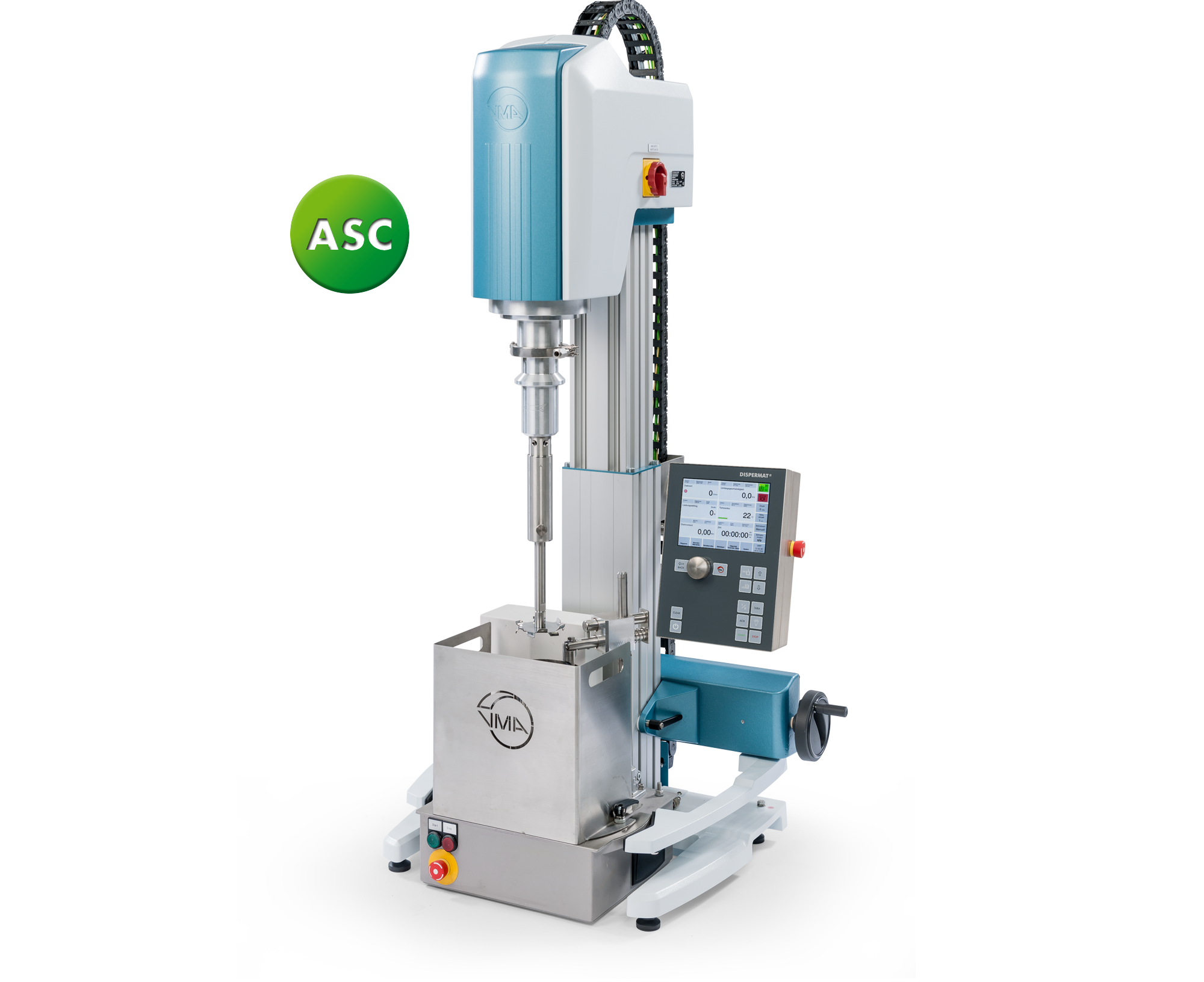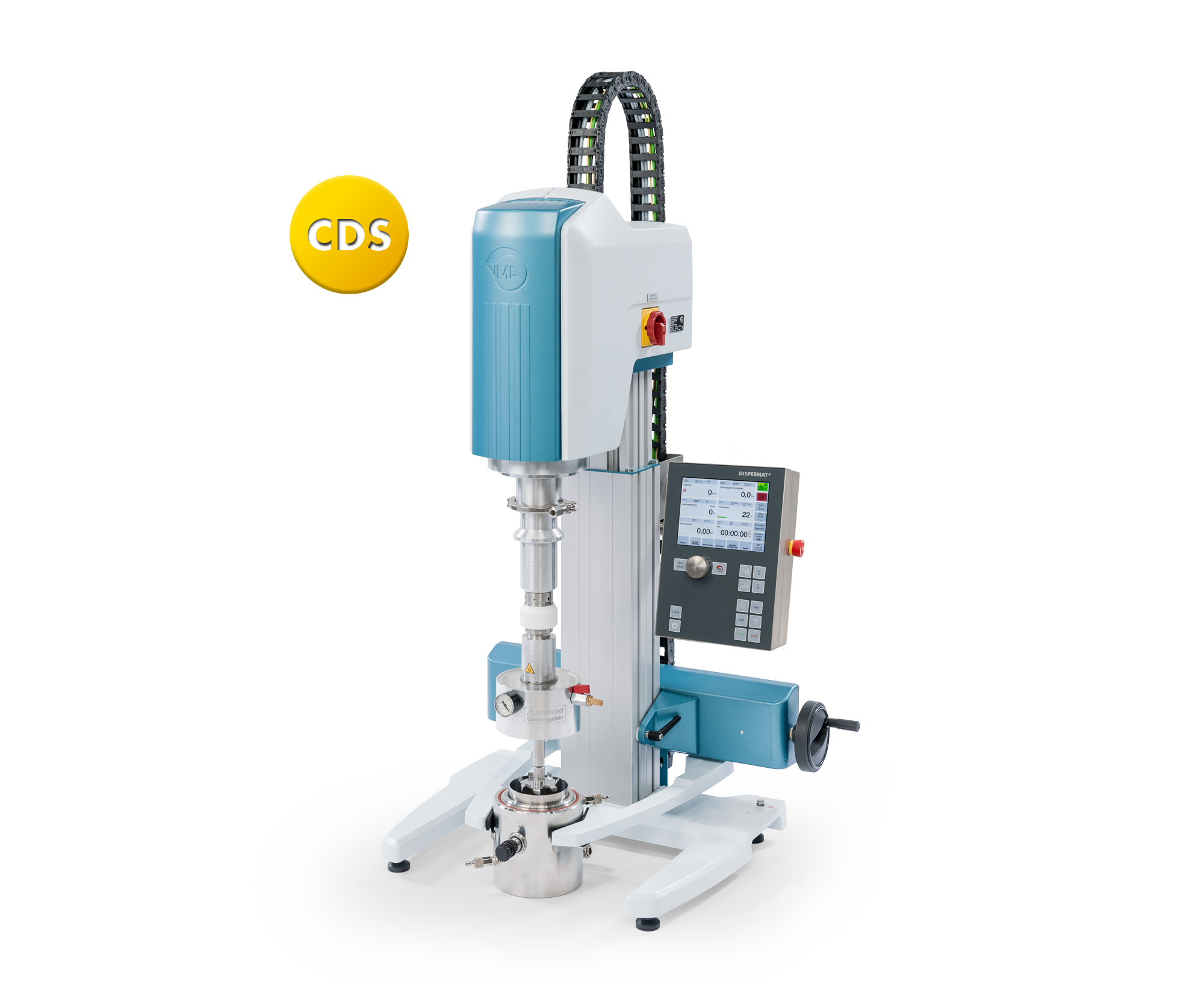 Der DISPERMAT® CN ist durch die elektrisch höhenverstellbaren Stative ein sehr bedienungsfreundlicher Allrounder für den Labor‒ und Technikumseinsatz. Die leistungsstärkste Version mit 11 kW eignet sich sogar für den Einsatz in der Kleinproduktion. Die kompakten und robusten Stative enthalten serienmäßig eine Sicherheitseinrichtung nach der Maschinenrichtlinie 2006/42/EG. Zusätzlichen Komfort bietet das robust gearbeitete zentrale Behälterspannsystem. Der Dispergierbehälter wird durch die Haltegabeln des Spannsystems zentrisch unter der Dissolverwelle ausgerichtet und sicher fixiert.